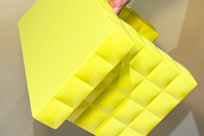 The design begins with stacking wooden pieces, akin to playing with blocks or erecting a structure. This process of aggregation—from individual blocks to a solid form—gives rise to a chair. What starts as a basic shape evolves into a full series, creating a cohesive and sturdy collection.This approach is rooted in memory. Designer‘s father, who worked for a construction company, built several small houses for our family. I often joined him, learning to lay bricks—ensuring each wall was perfectly plumb, each brick snug against its neighbor, each layer bound by mortar. This ritual, repeated countless times, forged a core belief: objects are vessels of memory.In keeping with this philosophy, every piece in the series is defined by simplicity and rigor. Take the chair: it is reduced to its essence—four legs, a seat, and a back. Composed of squares, it stands firmly on the ground, projecting strength, stability, and elegance. This marks a stark departure from my previous work, a transformation we see as a direct result of the discipline and restraint cultivated through years of independent living.Our goal was a chair that can fade into the background or command attention. Beneath its austere exterior, the collection surprises with luminous finishes and bold colors, introducing a note of playful whimsy. The design process mirrored childhood block-building: starting from chaos and moving toward order through a relentless search for harmony. We exercised extreme restraint, strictly planning every dimension as a multiple of a 5x5cm square.The wooden construction features subtly convex surfaces on every block, which catch the light to create shimmering highlights, enhancing the vibrant colors or finishes.The series currently comprises dining chairs, bar stools, dining tables, benches, stool, and mirrors, available in a variety of colors. We plan to expand this family in the future, exploring the endless possibilities of the squares.